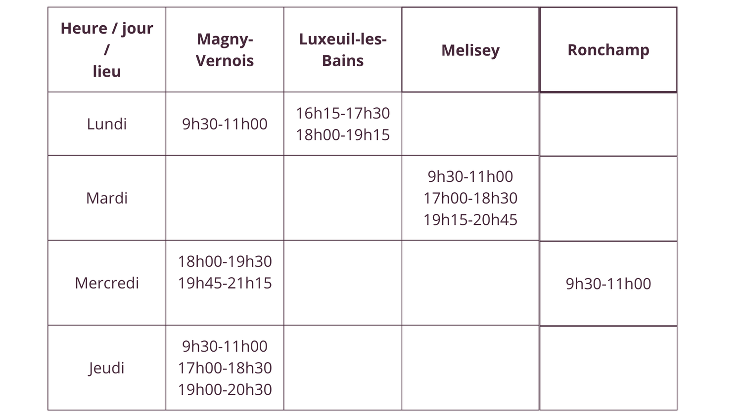 Pour plus d’informations, rendez-vous sur les pages dédiées : le planning et le descriptif des cours de yoga à Magny-Vernois, Melisey, Ronchamp et Luxeuil-les-Bains,ainsi que les tarifs...
