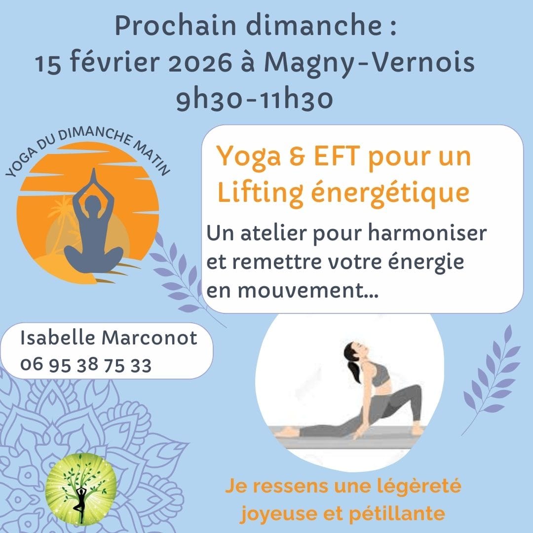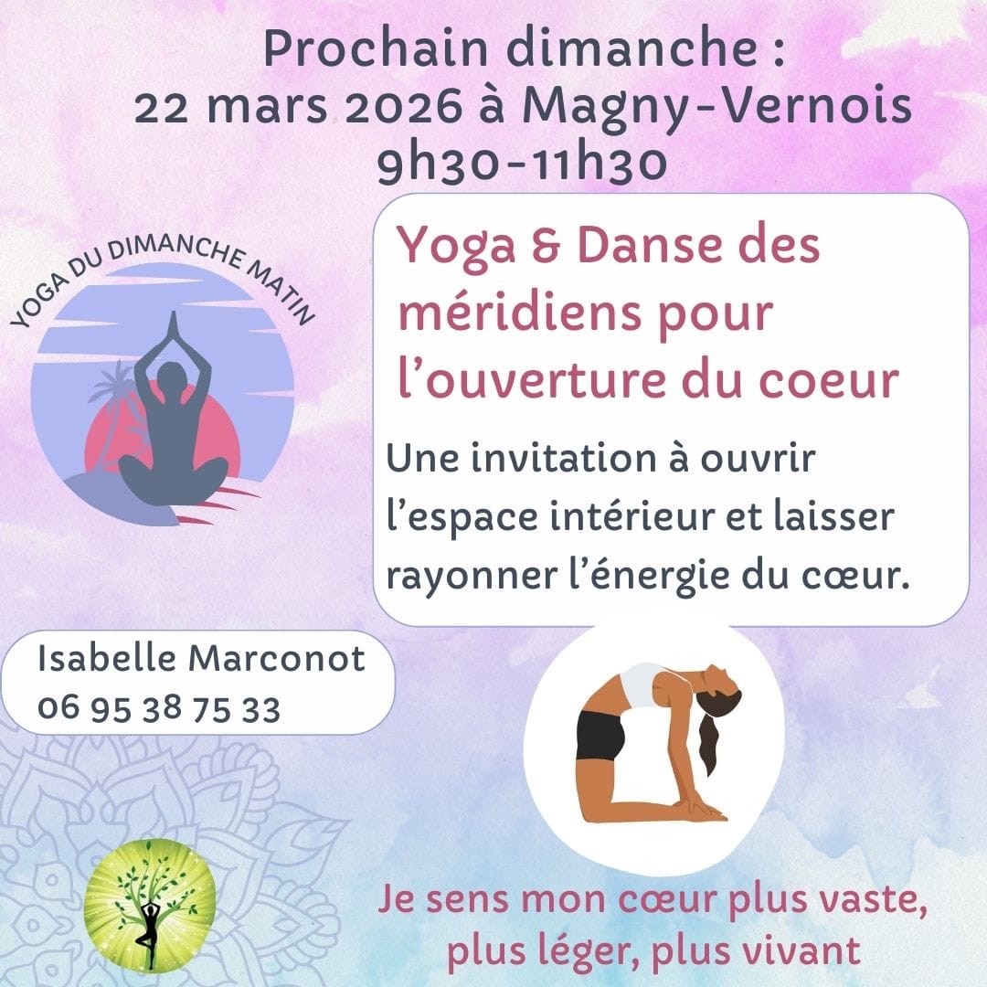 De mon côté, en collectif ou en individuel, à Magny-Vernois, Luxeuil-les-Bains et Melisey, je vous accompagne avec une approche bienveillante et sur mesure, mêlant yoga, souffle et coaching de vie — pour retrouver votre équilibre intérieur.
